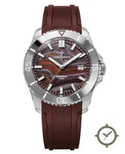 Eine Taucheruhr-Uhr mit einem markanten 44.5mm Auftritt am Handgelenk, gefertigt aus Edelstahl mit einem Zifferblatt in braun und einer besonderen "polished natural stone / agate-like marbling with striations"-Oberfläche.