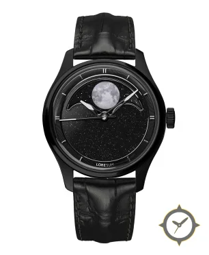 Eine Dress-Uhr mit einem vielseitigen 41mm Gehäuse, das an fast jedes Handgelenk passt, gefertigt aus Edelstahl mit einem Zifferblatt in schwarz und einer besonderen "aventurine-style (sparkling/starfield)"-Oberfläche und einer wunderschönen Mondphasenanzeige.