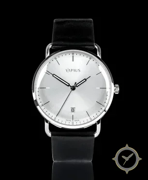 Eine Minimalistisch-Uhr mit einem 32.5mm Gehäuse im Vintage-Stil gefertigt aus Edelstahl mit einem Zifferblatt in silber und einer besonderen "sunburst (radial brushed)"-Oberfläche.