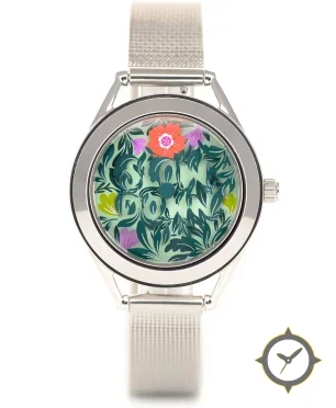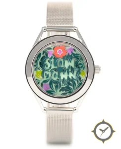 Eine Dress-Uhr mit einem markanten 44mm Auftritt am Handgelenk, gefertigt aus Edelstahl mit einem Zifferblatt in grün und einer besonderen "printed floral"-Oberfläche.