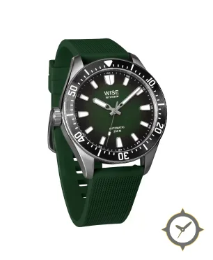 Eine Taucheruhr-Uhr mit einem markanten 45mm Auftritt am Handgelenk, gefertigt aus Edelstahl mit einem Zifferblatt in grün und einer besonderen "sunburst"-Oberfläche.