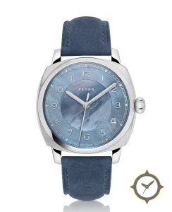 Eine Dress-Uhr mit einem markanten 47mm Auftritt am Handgelenk, gefertigt aus Edelstahl mit einem Zifferblatt in blau und einer besonderen "mother-of-pearl, iridescent"-Oberfläche.