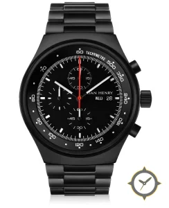 Eine Chronograph-Uhr mit einem vielseitigen 39.5mm Gehäuse, das an fast jedes Handgelenk passt, gefertigt aus Edelstahl mit einem Zifferblatt in schwarz und einer besonderen "matte"-Oberfläche.