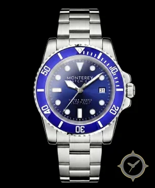 Eine Taucheruhr-Uhr mit einem markanten 45.5mm Auftritt am Handgelenk, gefertigt aus Edelstahl mit einem Zifferblatt in blau und einer besonderen "sunburst"-Oberfläche.