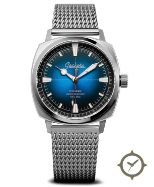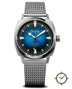 Eine Vintage-Uhr mit einem vielseitigen 41mm Gehäuse, das an fast jedes Handgelenk passt, gefertigt aus Edelstahl mit einem Zifferblatt in blau und einer besonderen "sunburst"-Oberfläche.