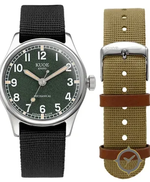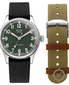 Eine Field-Uhr mit einem 28.5mm Gehäuse im Vintage-Stil gefertigt aus Edelstahl mit einem Zifferblatt in grün und einer besonderen "grained"-Oberfläche.