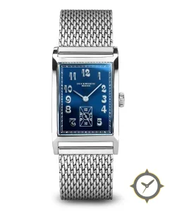 Eine Dress-Uhr mit einem 22mm Gehäuse im Vintage-Stil gefertigt aus Edelstahl mit einem Zifferblatt in blau und einer besonderen "sunburst/metallic finish"-Oberfläche.