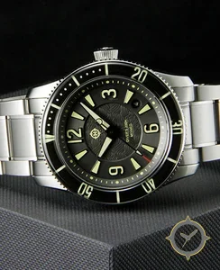 Eine Taucheruhr-Uhr mit einem markanten 46.5mm Auftritt am Handgelenk, gefertigt aus Edelstahl mit einem Zifferblatt in schwarz und einer besonderen "textured wavy/guilloche center with matte outer ring"-Oberfläche.