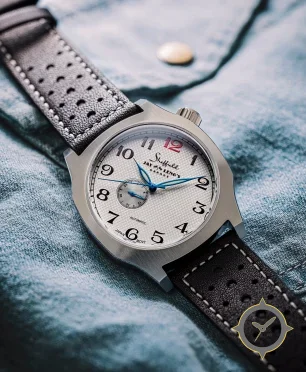 Eine Vintage-Uhr gefertigt aus Edelstahl mit einem Zifferblatt in weiß und einer besonderen "guilloche (hobnail / waffle)"-Oberfläche.