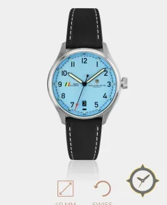 Eine Pilot-Uhr mit einem markanten 47mm Auftritt am Handgelenk, gefertigt aus Edelstahl mit einem Zifferblatt in türkis und einer besonderen "matte"-Oberfläche.