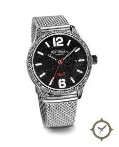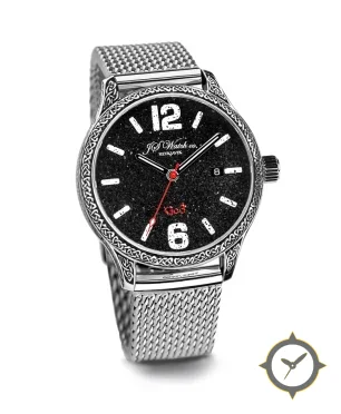 Eine Dress-Uhr mit einem markanten 43.5mm Auftritt am Handgelenk, gefertigt aus Edelstahl mit einem Zifferblatt in schwarz und einer besonderen "granular / speckled (sparkle-like)"-Oberfläche.