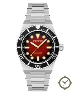 Eine Taucheruhr-Uhr mit einem 37mm Gehäuse im Vintage-Stil gefertigt aus Edelstahl mit einem Zifferblatt in rot und einer besonderen "sunburst / fumé gradient (deep red center fading to dark edges)"-Oberfläche.
