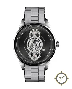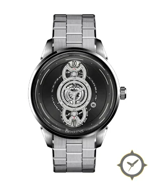 Eine Skelett-Uhr mit einem vielseitigen 41mm Gehäuse, das an fast jedes Handgelenk passt, gefertigt aus Edelstahl mit einem Zifferblatt in schwarz und einer besonderen "brushed"-Oberfläche.