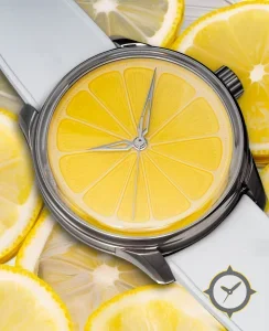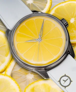 Eine -Uhr mit einem markanten 47mm Auftritt am Handgelenk, gefertigt aus Edelstahl mit einem Zifferblatt in gelb und einer besonderen "enamel"-Oberfläche.
