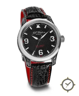 Eine Fahrer-Uhr mit einem markanten 42.5mm Auftritt am Handgelenk, gefertigt aus Edelstahl mit einem Zifferblatt in schwarz und einer besonderen "matte grained"-Oberfläche.