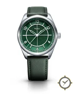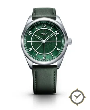 Eine Field-Uhr mit einem markanten 42mm Auftritt am Handgelenk, gefertigt aus Edelstahl mit einem Zifferblatt in grün und einer besonderen "grained (textured) center with concentric circular rings / guilloché"-Oberfläche.