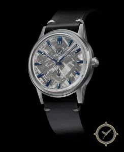 Eine Dress-Uhr mit einem markanten 44mm Auftritt am Handgelenk, gefertigt aus Edelstahl mit einem Zifferblatt in grau und einer besonderen "meteorite (Widmanstätten) texture"-Oberfläche.