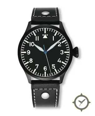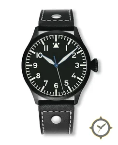 Eine Pilot-Uhr mit einem 34.5mm Gehäuse im Vintage-Stil gefertigt aus Edelstahl mit einem Zifferblatt in schwarz und einer besonderen "matte"-Oberfläche.
