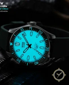 Eine Taucheruhr-Uhr mit einem vielseitigen 41mm Gehäuse, das an fast jedes Handgelenk passt, gefertigt aus Edelstahl mit einem Zifferblatt in türkis und einer besonderen "full-lume"-Oberfläche.
