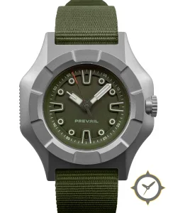 Eine Taktisch-Uhr mit einem 34.5mm Gehäuse im Vintage-Stil gefertigt aus Titan mit einem Zifferblatt in grün und einer besonderen "matte/grained finish"-Oberfläche.