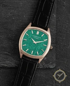 Eine Dress-Uhr mit einem vielseitigen 41mm Gehäuse, das an fast jedes Handgelenk passt, gefertigt aus Gold mit einem Zifferblatt in grün und einer besonderen "marbled/veined stone texture (malachite-like)"-Oberfläche.
