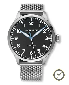 Eine Pilot-Uhr mit einem 36mm Gehäuse im Vintage-Stil gefertigt aus Edelstahl mit einem Zifferblatt in schwarz und einer besonderen "matte"-Oberfläche.