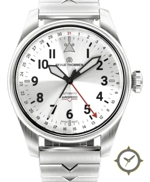 Eine Pilot-Uhr mit einem markanten 47.5mm Auftritt am Handgelenk, gefertigt aus Edelstahl mit einem Zifferblatt in silber und einer besonderen "sunburst / radial brushed"-Oberfläche.