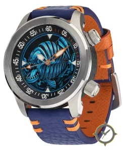 Eine Taucheruhr-Uhr mit einem markanten 50mm Auftritt am Handgelenk, gefertigt aus Edelstahl mit einem Zifferblatt in blau und einer besonderen "textured relief (fish skeleton motif)"-Oberfläche.