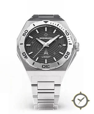 Eine Taucheruhr-Uhr mit einem markanten 44mm Auftritt am Handgelenk, gefertigt aus Edelstahl mit einem Zifferblatt in marineblau und einer besonderen "brushed finish with concentric ridges"-Oberfläche.