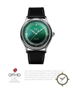 Eine Dress-Uhr gefertigt aus Edelstahl mit einem Zifferblatt in grün und einer besonderen "sunburst (radial gradient)"-Oberfläche.