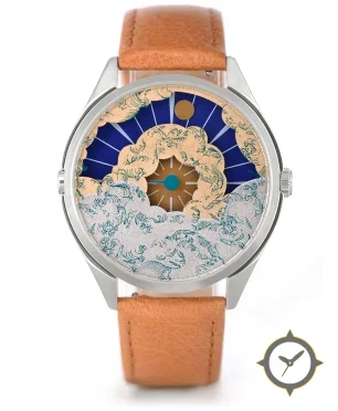 Eine Dress-Uhr mit einem 33.5mm Gehäuse im Vintage-Stil gefertigt aus Edelstahl mit einem Zifferblatt in blau und einer besonderen "engraved/embossed metallic finish with printed lacquer areas"-Oberfläche.