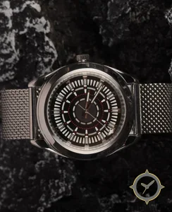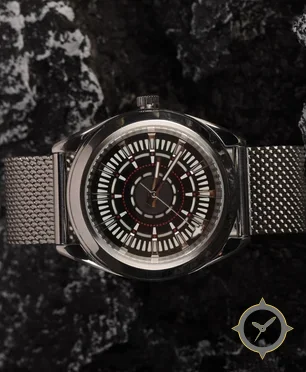 Eine Sport-Uhr mit einem markanten 42mm Auftritt am Handgelenk, gefertigt aus Edelstahl mit einem Zifferblatt in schwarz und einer besonderen "metallic with concentric open-work rings"-Oberfläche.