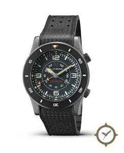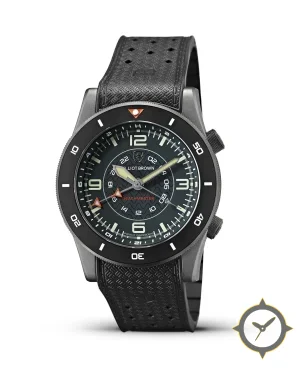 Eine Taucheruhr-Uhr gefertigt aus Edelstahl mit einem Zifferblatt in schwarz und einer besonderen "subtle wavy texture"-Oberfläche und einer echten GMT-Funktion, mit der du eine zweite Zeitzone verfolgen kannst.