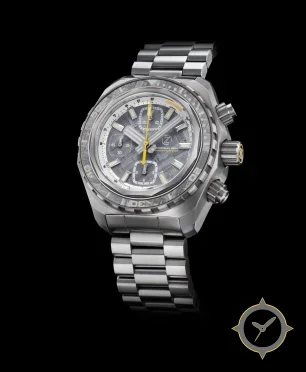 Eine Chronograph-Uhr mit einem markanten 41.5mm Auftritt am Handgelenk, gefertigt aus Edelstahl mit einem Zifferblatt in grau und einer besonderen "meteorite texture"-Oberfläche.