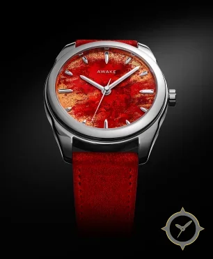 Eine Dress-Uhr mit einem markanten 44mm Auftritt am Handgelenk, gefertigt aus Edelstahl mit einem Zifferblatt in rot und einer besonderen "marbled lacquer with gold-flake accents"-Oberfläche.