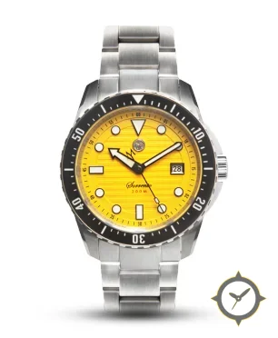 Eine Taucheruhr-Uhr mit einem markanten 50.5mm Auftritt am Handgelenk, gefertigt aus Edelstahl mit einem Zifferblatt in gelb und einer besonderen "horizontal grooves (textured lines)"-Oberfläche.