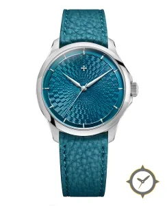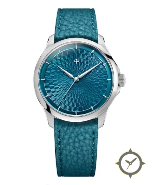 Eine Dress-Uhr mit einem 35.5mm Gehäuse im Vintage-Stil gefertigt aus Edelstahl mit einem Zifferblatt in türkis und einer besonderen "guilloché (radiating wavy pattern)"-Oberfläche.