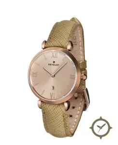 Eine Dress-Uhr mit einem 33mm Gehäuse im Vintage-Stil gefertigt aus Gold mit einem Zifferblatt in gold und einer besonderen "sunburst"-Oberfläche.