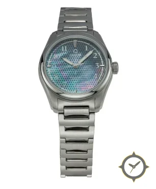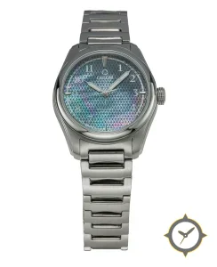 Eine Dress-Uhr mit einem 31mm Gehäuse im Vintage-Stil gefertigt aus Edelstahl mit einem Zifferblatt in türkis und einer besonderen "mother-of-pearl iridescent finish with a textured/guilloché feel"-Oberfläche.