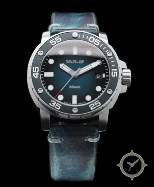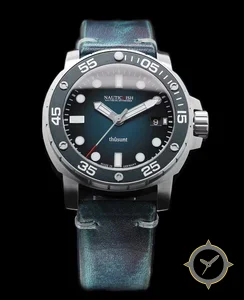 Eine Taucheruhr-Uhr mit einem markanten 42mm Auftritt am Handgelenk, gefertigt aus Edelstahl mit einem Zifferblatt in blau und einer besonderen "sunburst gradient (fume)"-Oberfläche.