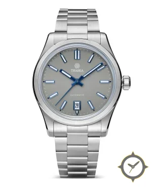 Eine Sport-Uhr mit einem 35.5mm Gehäuse im Vintage-Stil gefertigt aus Edelstahl mit einem Zifferblatt in grau und einer besonderen "matte"-Oberfläche.