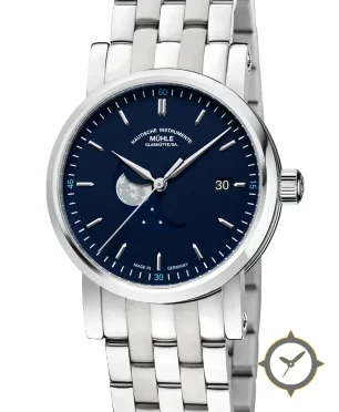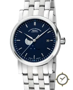 Eine Dress-Uhr mit einem markanten 43mm Auftritt am Handgelenk, gefertigt aus Edelstahl mit einem Zifferblatt in marineblau und einer besonderen "lacquer"-Oberfläche und einer wunderschönen Mondphasenanzeige.
