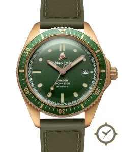 Eine Taucheruhr-Uhr mit einem markanten 45.5mm Auftritt am Handgelenk, gefertigt aus Bronze mit einem Zifferblatt in grün und einer besonderen "glossy domed"-Oberfläche.
