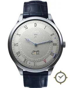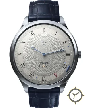 Eine Dress-Uhr mit einem markanten 48mm Auftritt am Handgelenk, gefertigt aus Edelstahl mit einem Zifferblatt in silber und einer besonderen "engine-turned guilloché (radial starburst)"-Oberfläche.