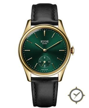 Eine Dress-Uhr mit einem 35mm Gehäuse im Vintage-Stil gefertigt aus Gold mit einem Zifferblatt in grün und einer besonderen "sunburst"-Oberfläche.