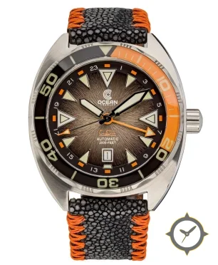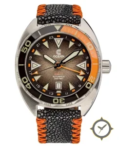 Eine Taucheruhr-Uhr mit einem markanten 48mm Auftritt am Handgelenk, gefertigt aus Edelstahl mit einem Zifferblatt in braun und einer besonderen "sunburst"-Oberfläche und einer echten GMT-Funktion, mit der du eine zweite Zeitzone verfolgen kannst.