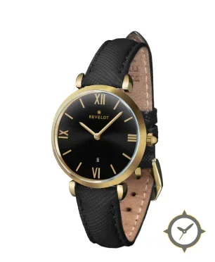 Eine Dress-Uhr mit einem 28.5mm Gehäuse im Vintage-Stil gefertigt aus Gold mit einem Zifferblatt in schwarz und einer besonderen "sunburst"-Oberfläche.