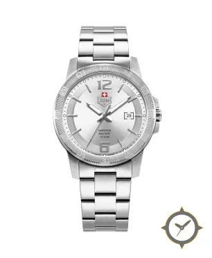 Eine Militär-Uhr mit einem vielseitigen 40mm Gehäuse, das an fast jedes Handgelenk passt, gefertigt aus Edelstahl mit einem Zifferblatt in silber und einer besonderen "sunburst"-Oberfläche.