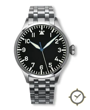 Eine Pilot-Uhr mit einem 35.5mm Gehäuse im Vintage-Stil gefertigt aus Edelstahl mit einem Zifferblatt in schwarz und einer besonderen "matte"-Oberfläche.