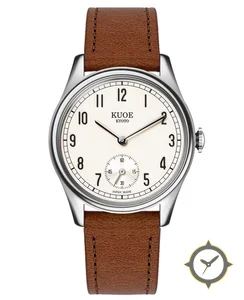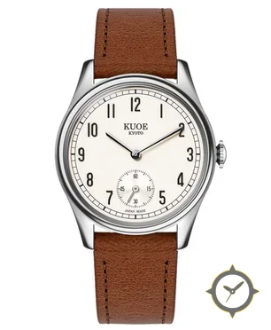Eine Dress-Uhr mit einem 35mm Gehäuse im Vintage-Stil gefertigt aus Edelstahl mit einem Zifferblatt in weiß und einer besonderen "matte"-Oberfläche.